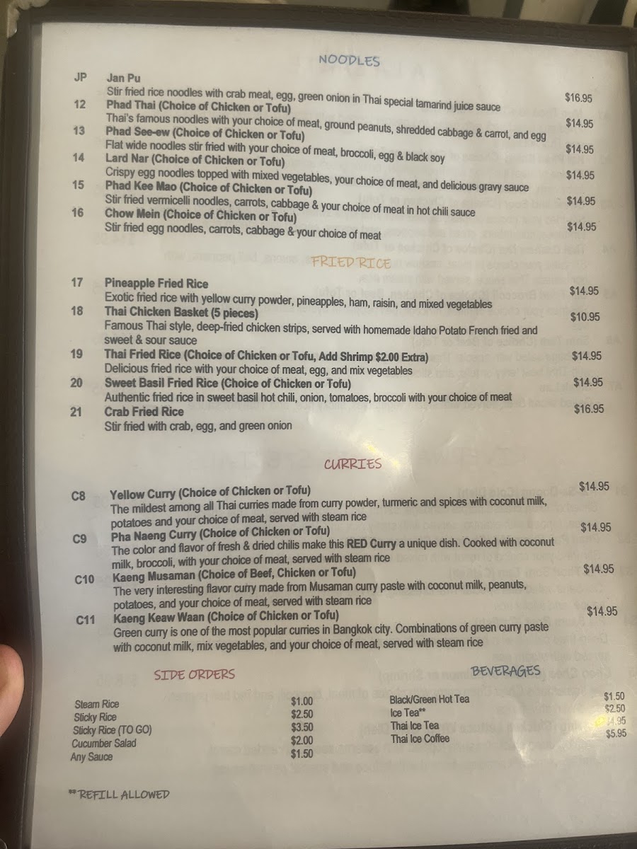 The menu is a delightful exploration of flavors, featuring standout dishes like the Larb Kai chicken salad and Tom Yum Kai vegetable soup. Those craving comfort will adore the Yellow Curry, packed with tender chicken and potatoes, and the crispy Spring Rolls make for a perfect appetizer. For a truly satisfying experience, don’t miss the rich Crab Fried Rice and a refreshing Thai Iced Tea to wash it down.